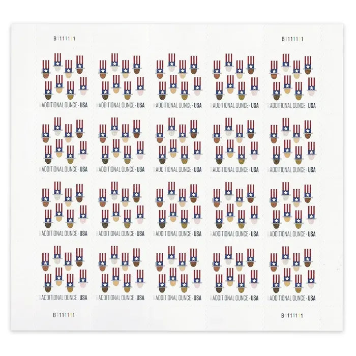 According to the USPS, ��The stamp features eight graphic top hats in Uncle Sam��s signature style, with red and white vertical stripes above a blue band with a white star and a gray brim. Beneath each hat is an oval shape representing a face, each in a different shade, meant to suggest the ethnic and racial diversity of the United States.�� The stamps were designed by USPS art director Antonio Alcal��.?