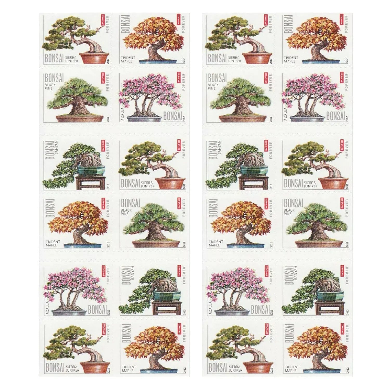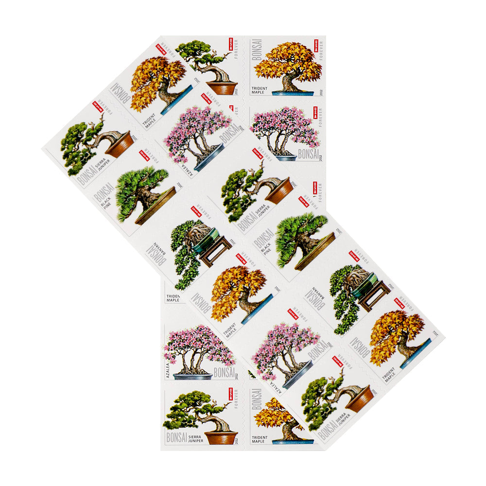 With these five Bonsai (Forever) stamps, the U.S. Postal Service celebrates the beauty of bonsai. The word ?¡ãbonsai?¡À (China for ?¡ãplant in a pot?¡À) refers to the art of cultivating plants, usually trees, in trays, pots, or other containers. Favorite bonsai plants include evergreens, maples, and azaleas, but many other trees and shrubs are also suitable.